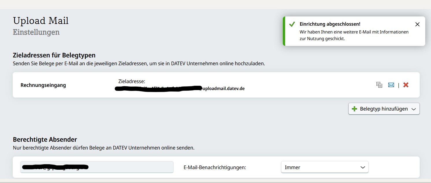 Es wird Ihnen die für Sie gültige E-Mail-Adresse für den jeweiligen Belegtyp (i.d.R. Rechnungseingang) angezeigt. Sie können nun Belege per E-Mail hochladen.
